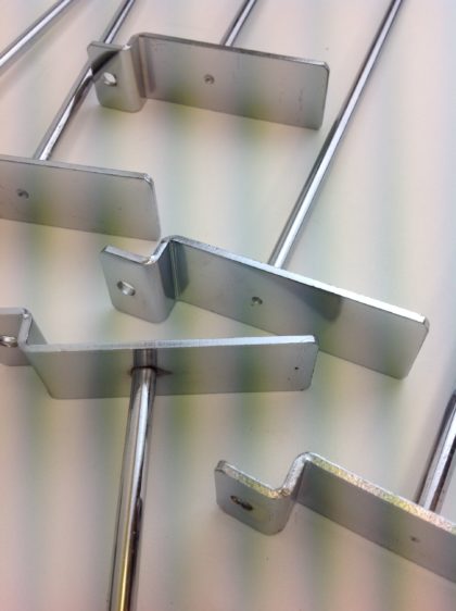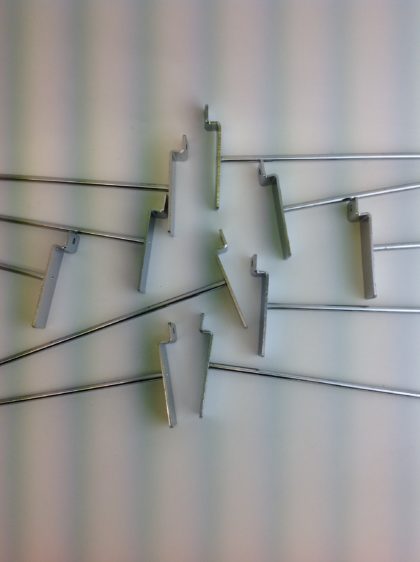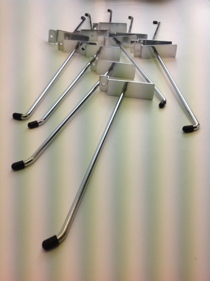 ONE HUNDRED of 10-inch chrome hooks for slat-wall retail display panels.