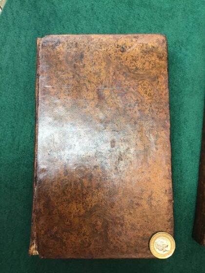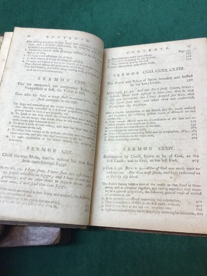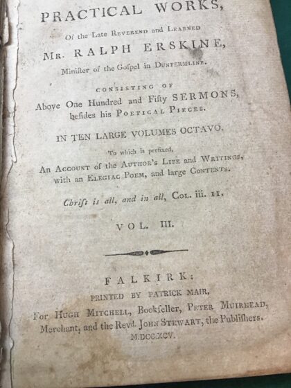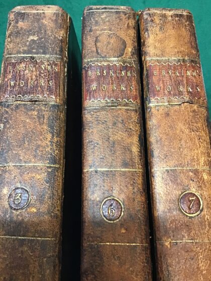 Well-thumbed leather-bound first editions of the great sermons [and other practical works] by the noted Scottish preacher Rev Ralph Erskine, dated for 1796, 1796, and 1795.