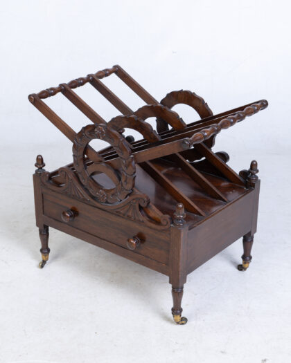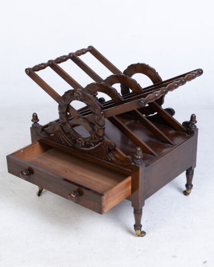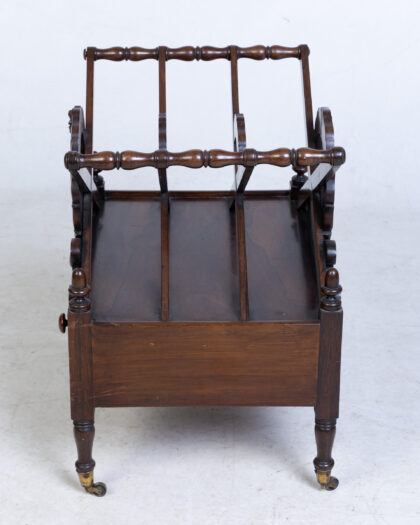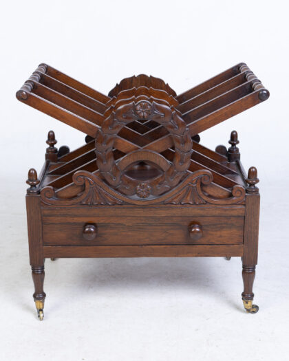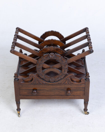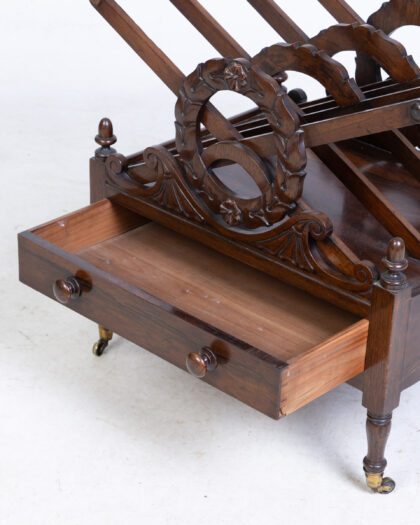 Antique 1810-20 Rosewood Canterbury with drawer and turned legs. Elegant storage for books or sheet music. Decorative fretwork. Excellent condition.