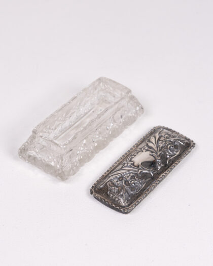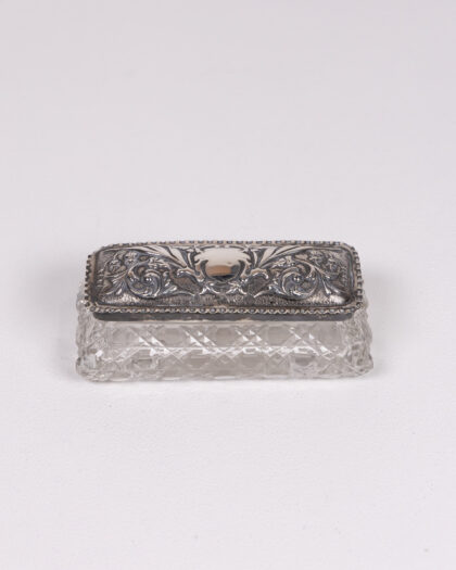 Vintage rectangular trinket box featuring a clear crystal base with a diamond-cut pattern and a 1906 Birmingham hallmarked sterling silver lid. The lid is adorned with ornate floral and foliate detailing, including a central cartouche. This decorative piece would be perfect for storing small treasures or adding a touch of elegance to any dresser or vanity.