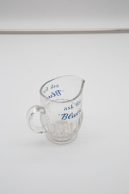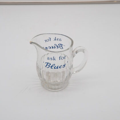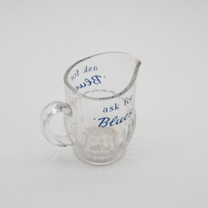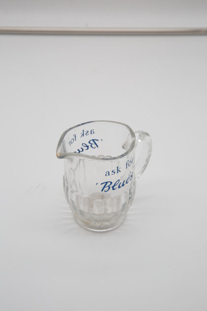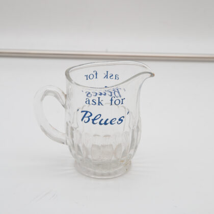 A glass bartop water jug. Bears blue lettering which reads, “Ask for ‘Blues'”.