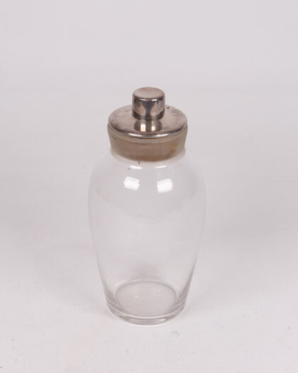 This is an antique glass cocktail shaker with a lid. The jar has a classic shape which adds to its vintage appeal. The condition is good, with some signs of wear consistent with age. This item would make a great addition to any home bar.