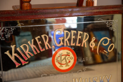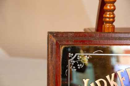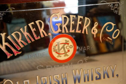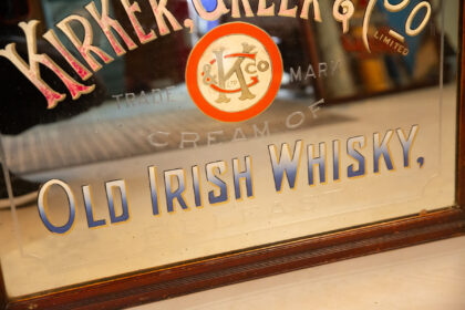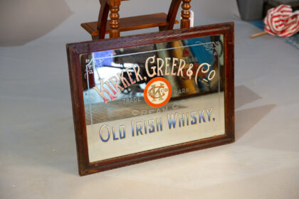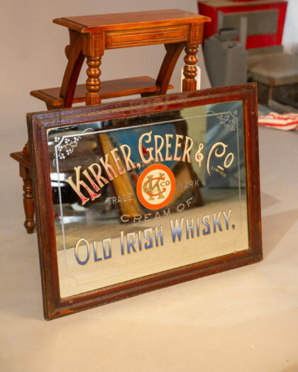 An original 1920s mirror for Kirker, Greer & Co. Old Irish Whisky with original frame, gilding and gradient lettering.