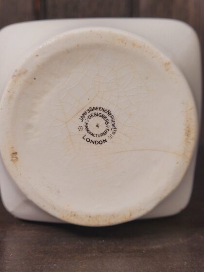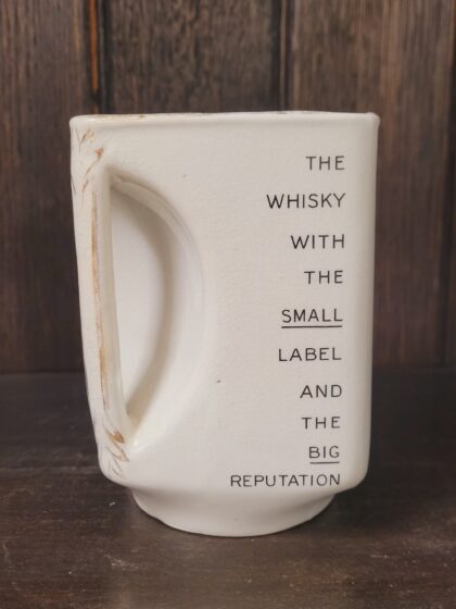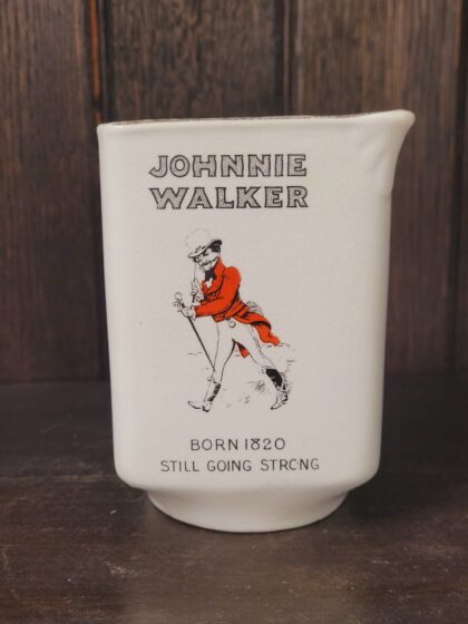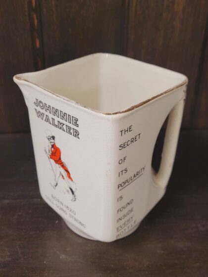 A white glazed ceramic bartop water jug. Bears black lettering which reads, "Johnnie Walker Born 1820 Still Going Strong" on two sides, "The Secret of its Popularity is Found Inside Every Bottle" on one side and, "The Whisky with the Small Label and the Big Reputation" on one side. Made by James Greene Nephew Ltd. Designers & Manufacturers London & Hanley and bears black backstamp to base. Features an integrated handle and gilt decoration.