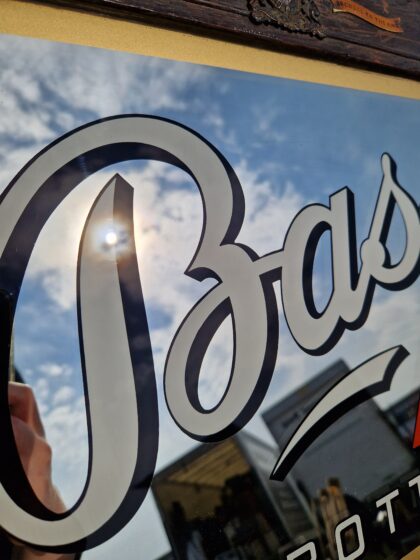 An original 1930s Bass in Bottle mirror complete with shield and banners.