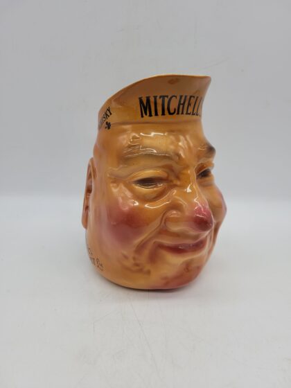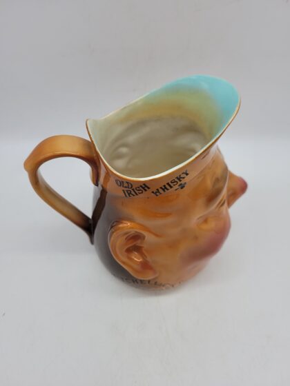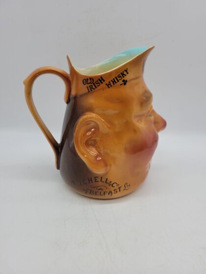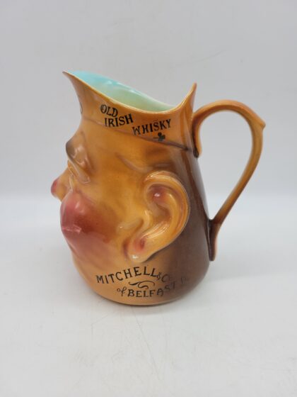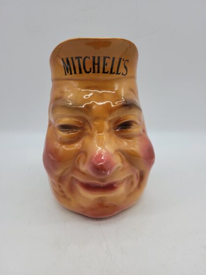A glazed ceramic Mitchell's & Co of Belfast Ltd. character bartop water jug. Bears black lettering and is in the form of a smiling man. Made in England.