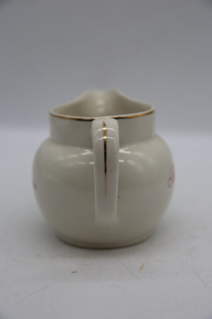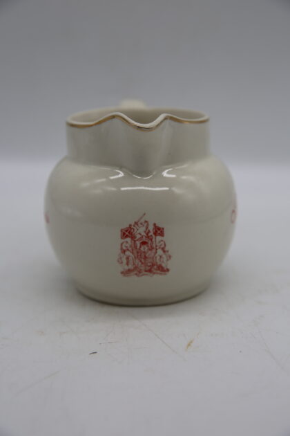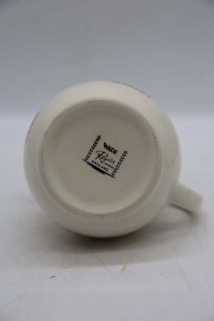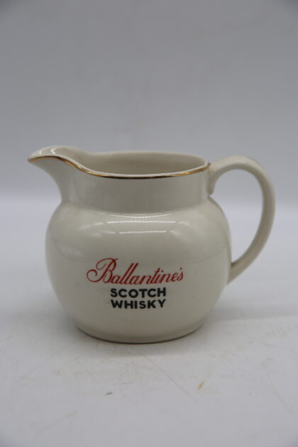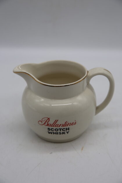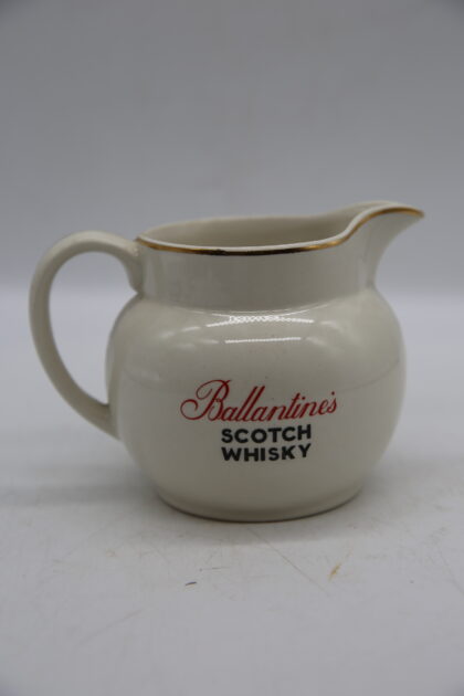 A white glazed ceramic bartop water jug. Bears red and black lettering which reads, "Ballantine's Scotch Whisky" and gilt decoration. Made by wade and bears black backstamp to base.