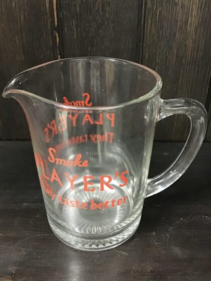 A 1950s Player's glass jug. Bears red lettering that reads "Smoke Player's They Taste Better" on both sides.
