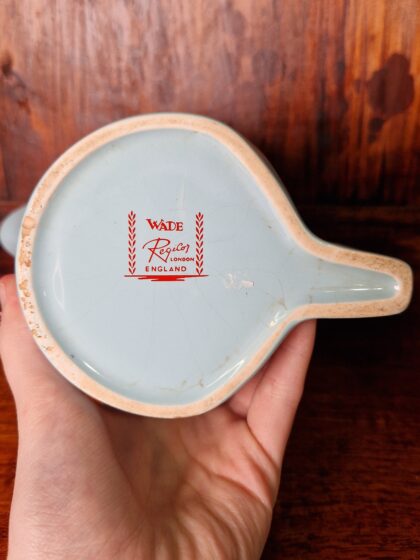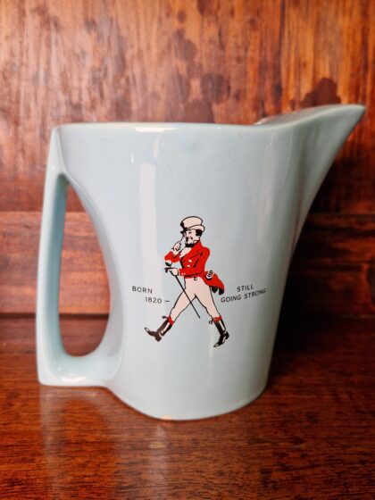 A blue ceramic bartop water jug. Bears lettering which reads, "Born 1820 - Still Going Strong". Made by Wade and bears red backstamp to base.