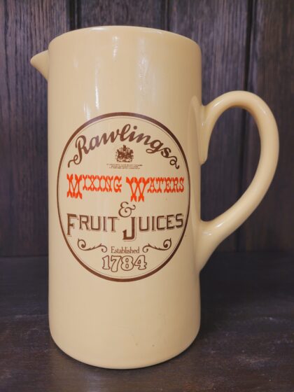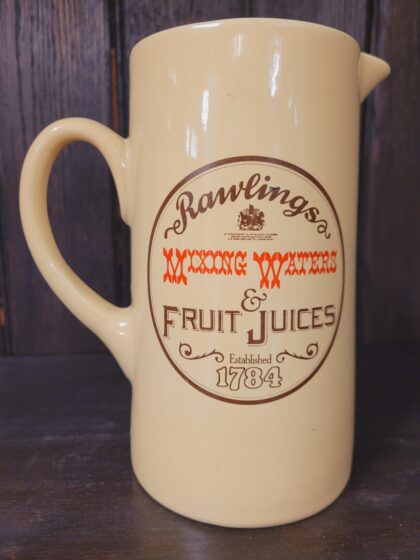 A yellow glazed ceramic bartop water jug. Bears brown and red lettering which reads, "Rawlings Mixing Waters & Fruit Juices Established 1784". Bears black backstamp to base.