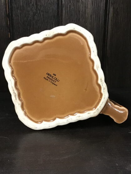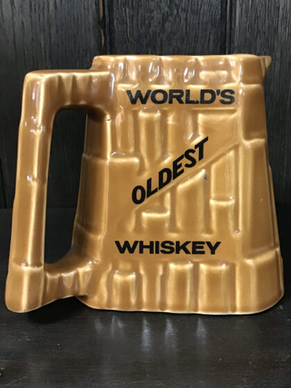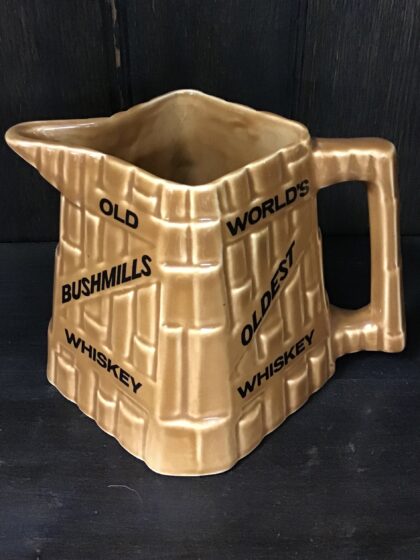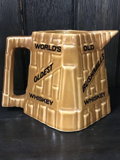 A brown glazed ceramic bartop water jug. Bears black lettering that reads "Old Bushmills Whiskey" on two sides and, "World's Oldest Whiskey" on two sides. Made by Arklow England and bears black backstamp to base.