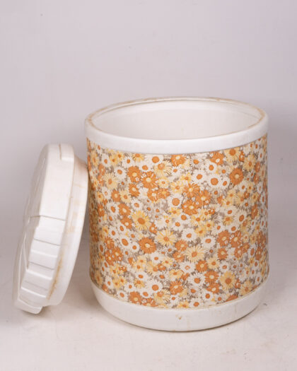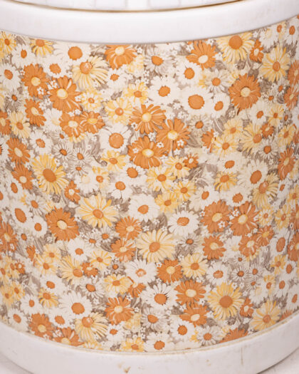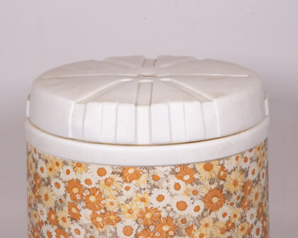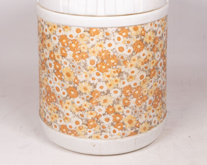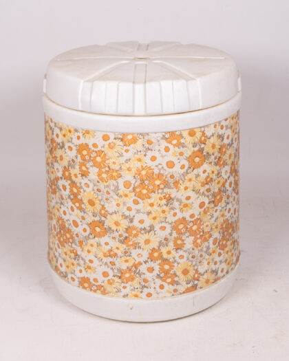 Retro insulated food or beverage container with lid. White moulded plastic shell with snap-on lid. The insulated core is wrapped in a cream and orange floral patterned fabric.
