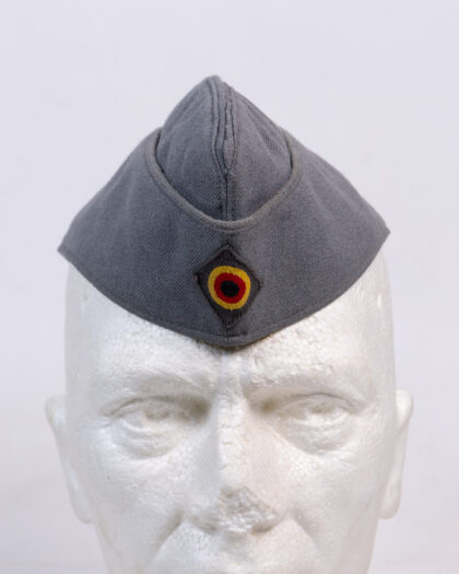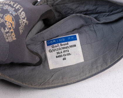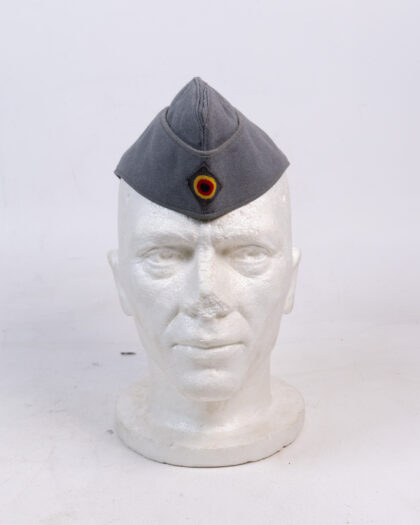 Vintage German garrison cap, grey fabric, badge at front, inner maker's label Doring FW, dated 30.4.1972. Collectible military headwear.