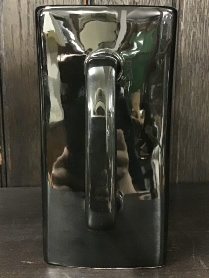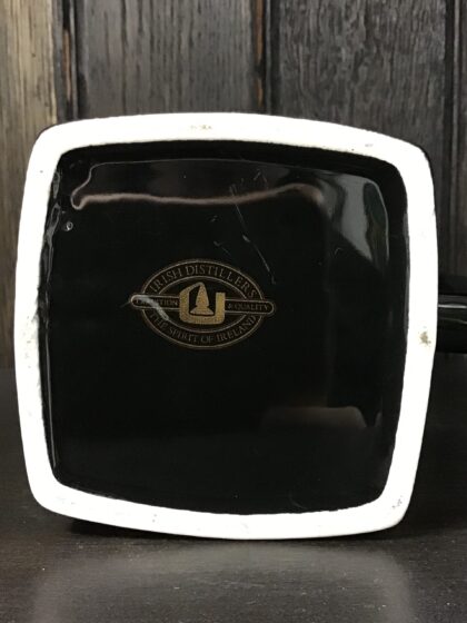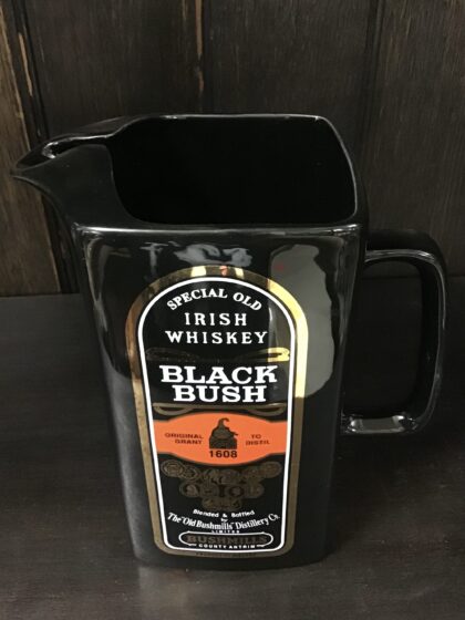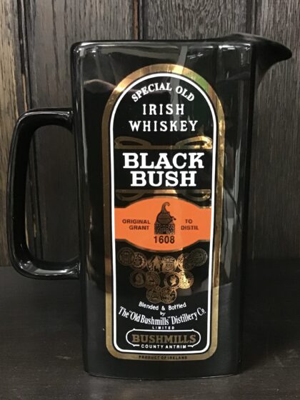 A black glazed ceramic bartop water jug. Bears white lettering that reads "Special Old Irish Whiskey Black Bush" and gilt decoration. Made by Irish Distillers and bears gilt backstamp to base.