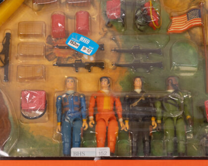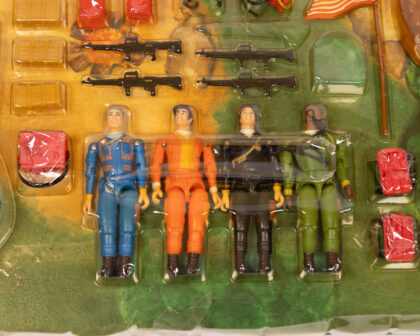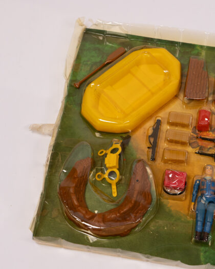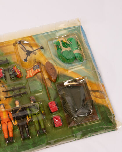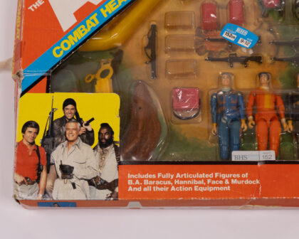 Vintage Galoob 'The A-Team' Combat Headquarters Set. This toy playset is a collectible from the 1980s featuring the main characters Hannibal, Face, B.A. Baracus, and Murdock. Includes accessories such as weapons, raft, flag, sandbags and more. The box is orange with colourful graphics. The set is in used condition and the box shows signs of wear, including scuffs and tears on the edges. The plastic covering the items inside is loose in places. Great nostalgic piece for an A-Team or vintage toy collector.