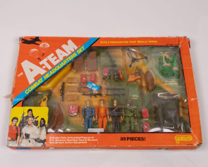 Vintage 'The A-Team' Combat Headquarters Set by Galoob. Includes figures, accessories and original box. A nostalgic item for collectors. Box shows wear.