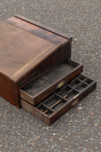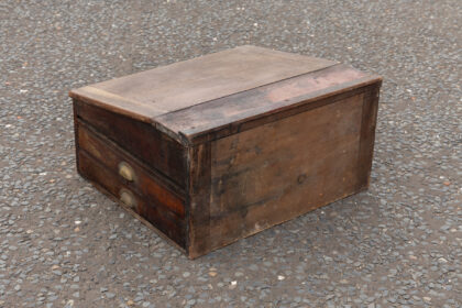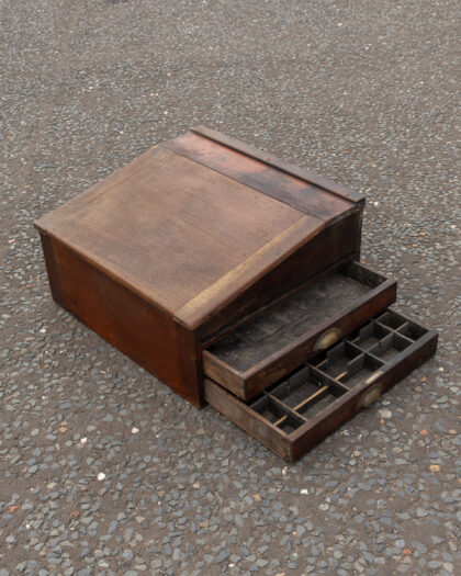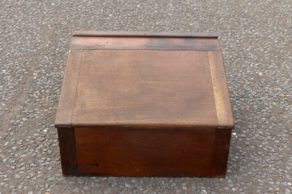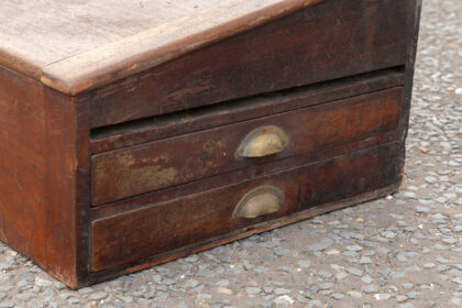 This 19th-century mahogany teller's desk features a sloping writing surface and two drawers, ideal for storing documents and stationery. Its compact size makes it a versatile addition to any home or office.