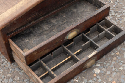 Antique mahogany teller's desk with two drawers. Perfect for a vintage office or unique home decor. Circa 1800s. A timeless piece!
