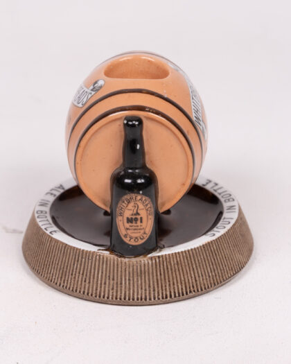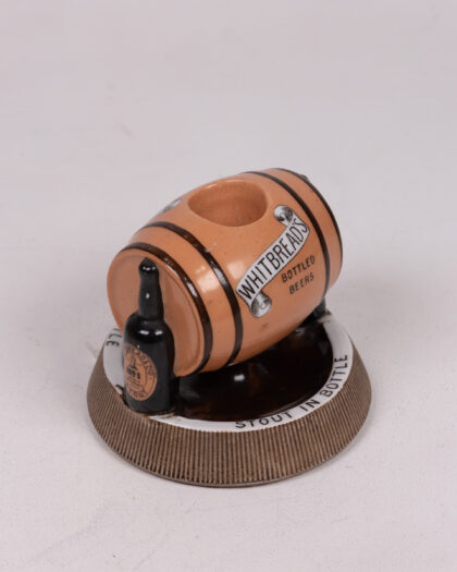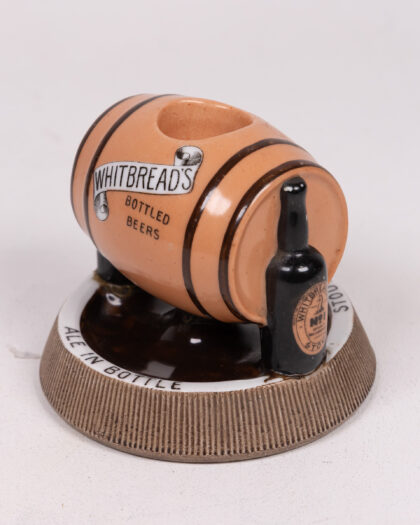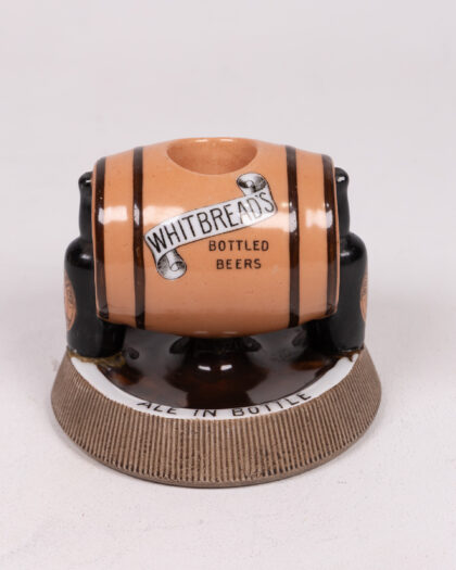 19th century Whitbread's beers ceramic match holder and striker with barrel design and miniature beer bottles. A unique breweriana collectible in excellent condition.