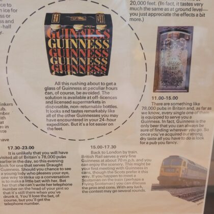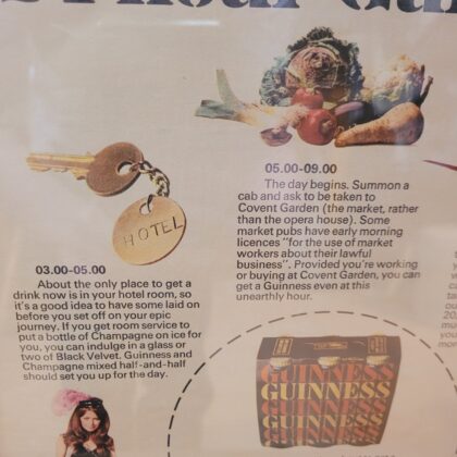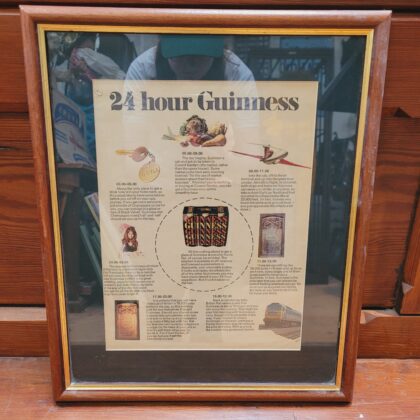 A framed poster detailing how to buy a Guinness at all hours of the day.