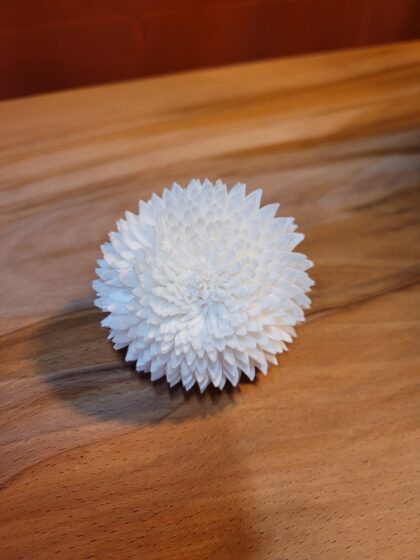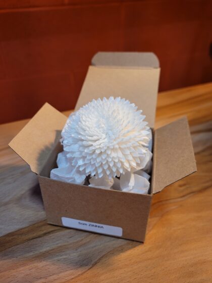 Zinnia Diffuser flower 5cm, natural unbleached finish in cardboard presentation box wired cord wick unwinds to absorb fragrance up in to the flower head.