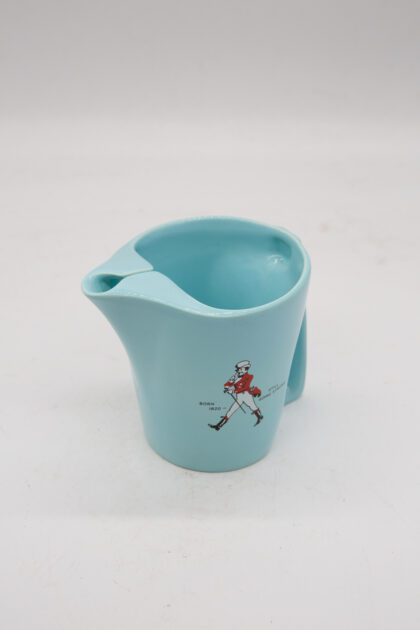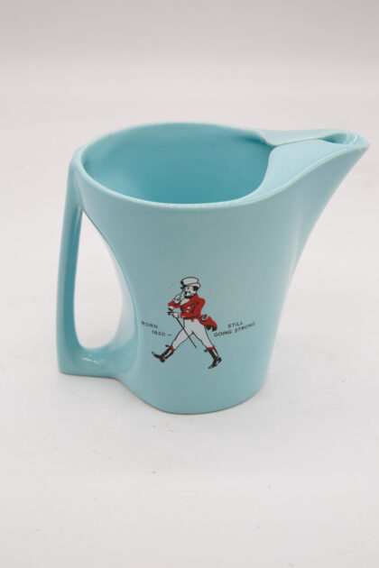 A blue ceramic bartop water jug. Bears lettering which reads, “Born 1820 – Still Going Strong”. Made by Wade and bears red backstamp to base.