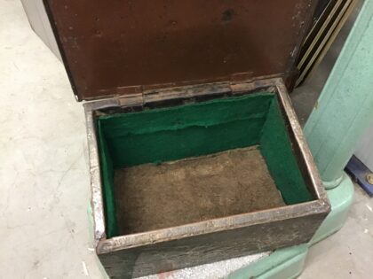 Handy brass coated storage box for slippers. Sloped top. 36x25cm and 20cm max height. Lined with sacking and felt. Great fireside box for toasty slippers.