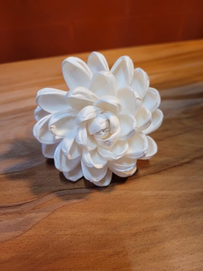 8cm lotus bloom in natural unbleached finish in small cardboard presentation box wired cord wick unwinds to absorb fragrance up in to the flower head. Lasts 9-12 months.
