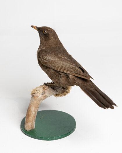 This taxidermy ring ouzel features realistic plumage and is mounted on a sturdy wooden stand with a green base. It is a perfect decorative piece for nature enthusiasts and collectors. The bird is in excellent condition, showcasing intricate details and lifelike features.
