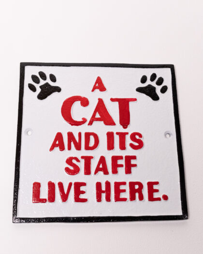 This cast iron plaque comes with the message "A Cat And Its Staff Live Here". The sign is handpainted in vintage white, the raised border and lettering is in contrast black. Two paw marks in the upper corners reinforce the message! Made from durable cast iron, this sign will provide smiles for years to come. Predrilled holes make it a breeze to hang on a wall of your choice. A perfect gift for cat owners, or a great addition to any house where a cat rules the roost!