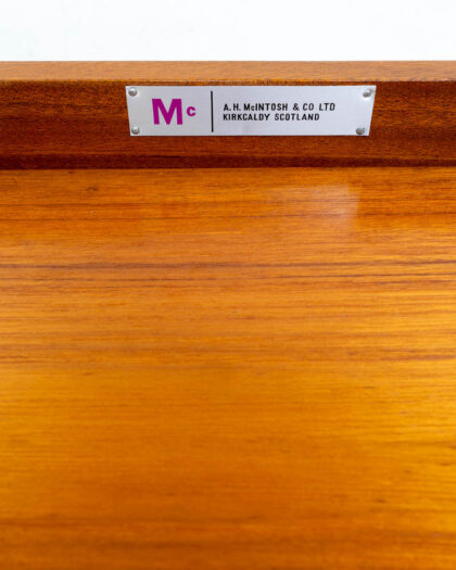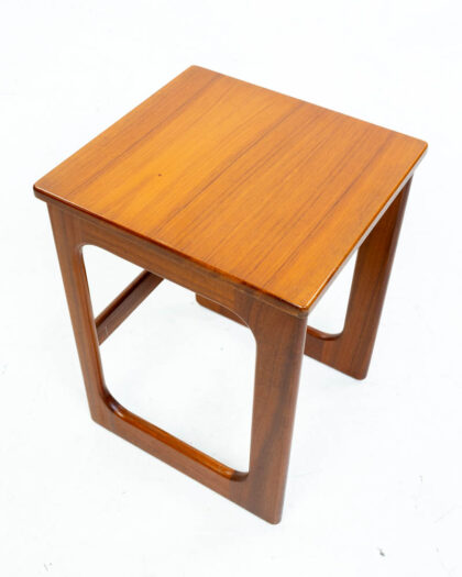 Mid-century teak nest of three tables made by A H Mcintosh of Kirkcaldy, Scotland. The tables are constructed of teak, with curved legs and rounded corners to the tops. The largest table has a flip over top. The set comes with a makers mark. The tables are in good condition with some signs of age, and would be ideal for any living space.