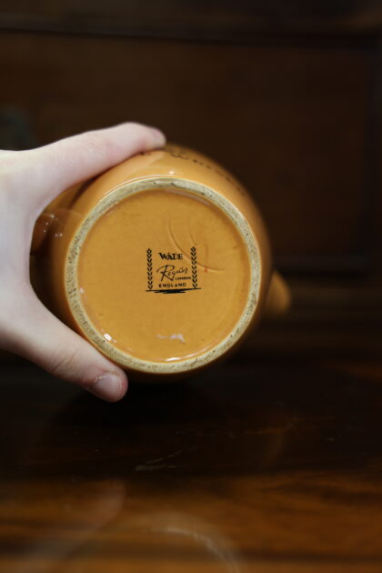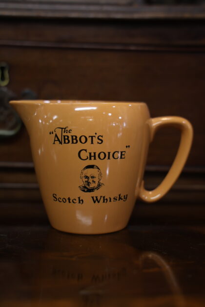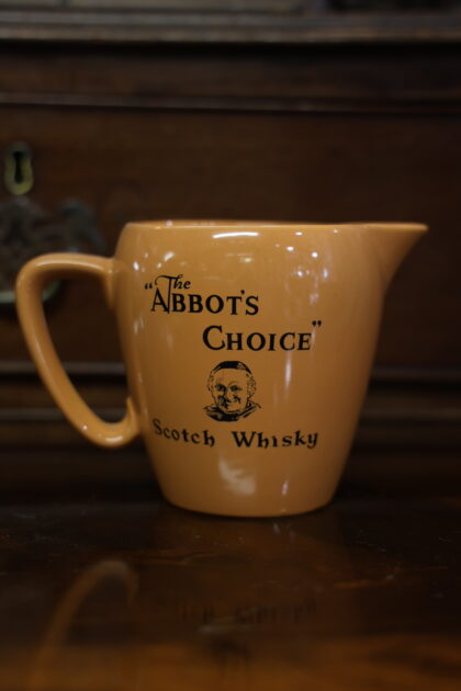 An orange ceramic water jug for The Abbot's Choice Scotch Whisky. Made by Wade.