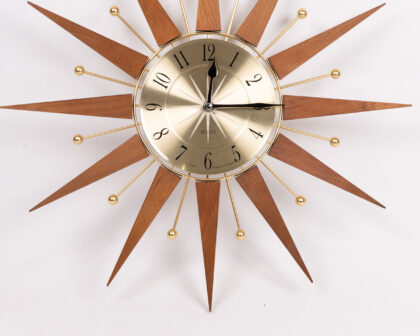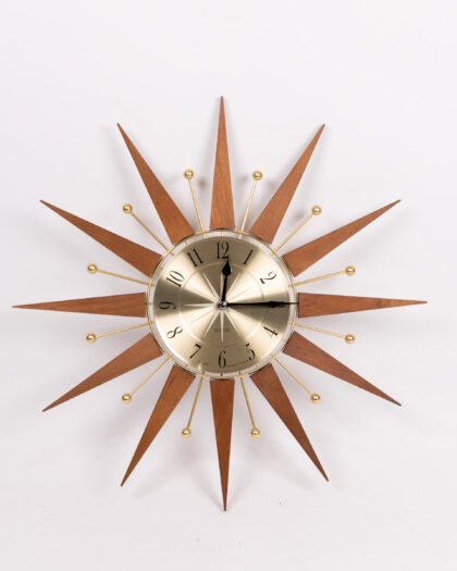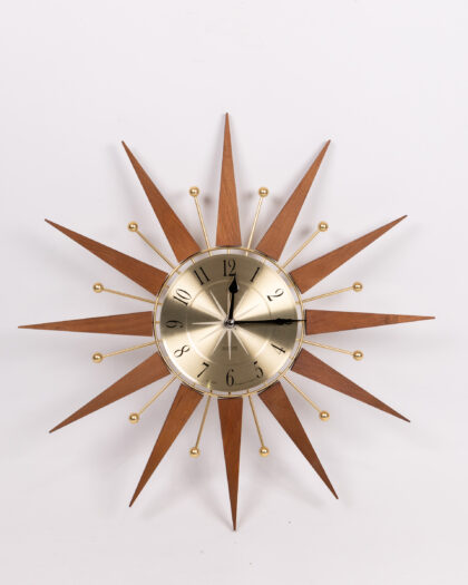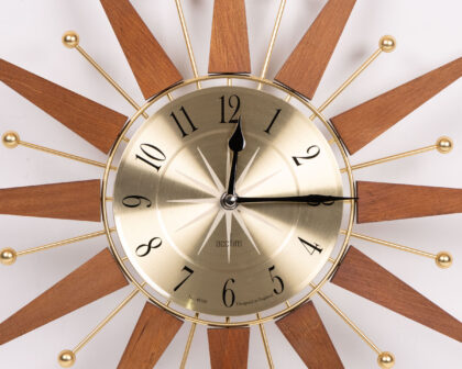 Acctim starburst wall clock. Mid-century modern style design with wooden rays and gold face. Stylish decor for any room!