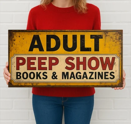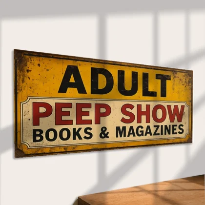 Novelty metal sign featuring an "Adult Peep Show Books & Magazines" design. Ideal for adding a touch of retro charm to any space.