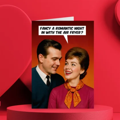 A funny Valentine's Day card featuring a vintage-style photograph of a smiling couple standing close together against a red-to-orange background. A man in a dark sweater looks affectionately at a woman wearing a pink top and patterned scarf. A speech bubble above them reads 'Fancy a romantic night in with the air fryer?'