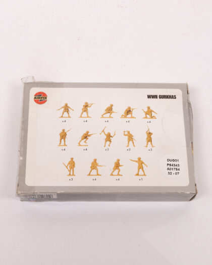 Vintage Airfix WWII Gurkhas plastic model kit in original box. Model number A01754. Box lists the contents and number of figures included. The model kit appears to be incomplete - contents are unverified. Box shows shelf wear and some crushing. Great for a collector or to build and paint.