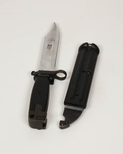 Military bayonet with a silver-tone blade and black plastic handle and scabbard. Some wear. See photos.