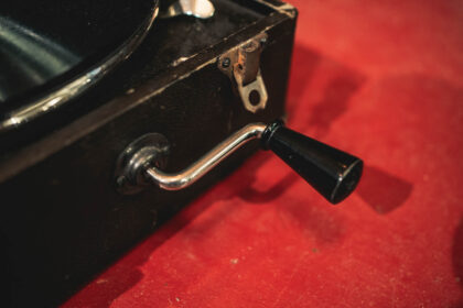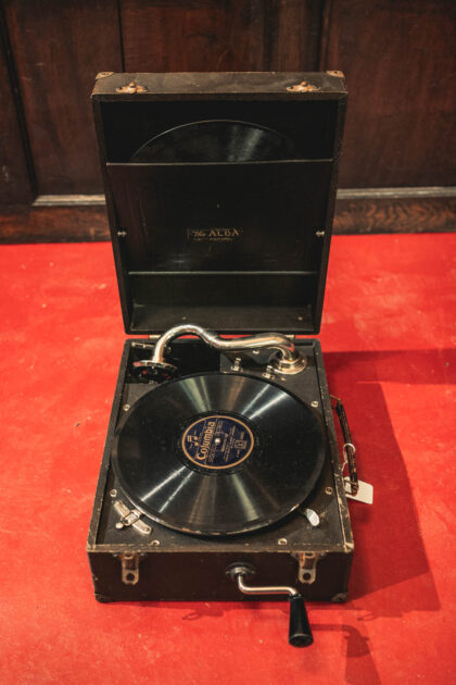 Vintage record player for shellac 78s. Wind-up handle, adjustable speed and speaker built into needle. All still in working condition.