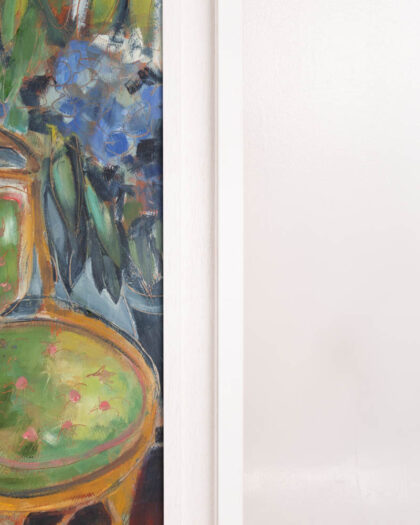 This is an original oil on board painting by artist Fleur Jackson titled 'Amanda with chair'. The painting showcases an impressionistic style with bright, expressive colours. The subject matter includes a standing figure dressed in green, a chair, and an interior background featuring shelves and artwork. The brushstrokes are visible and add texture to the piece. It is framed and ready to display, this artwork would be a fantastic addition to any living room, bedroom, or office space, adding a touch of elegance and sophistication to the atmosphere.