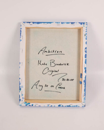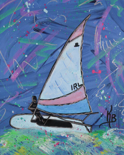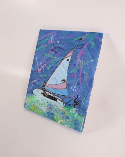 This is a brand new acrylic painting on canvas by the artist Kate Broderick. The painting features a boat sailing on water. The background is a vibrant blue, with splashes of green and white to create a sense of movement and energy. The boat itself is rendered in a simple, graphic style, with bold outlines and flat planes of colour, approximately 36 cm (height) & 28cm (width). The painting is signed by the artist in the bottom right corner. The painting would look great hung in a living room, bedroom, or any space where you want to add a pop of colour and vibrancy.