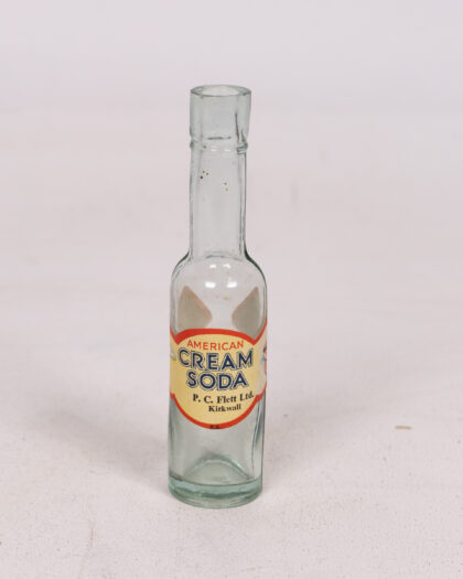 An American Cream Soda bottle with a clear glass body and a paper label. The label has a red border and yellow background with the words 'American Cream Soda' printed in bold black letters. The label also includes the text 'P. C. Flett Ltd. Kirkwall'. The bottle is a collectable item.