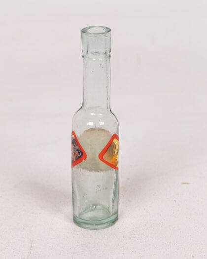 American Cream Soda bottle, collectable clear glass bottle, featuring a distinctive red and yellow paper label with text.