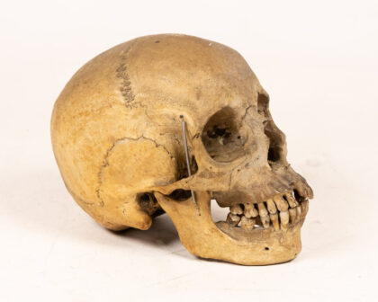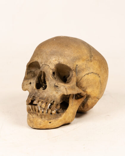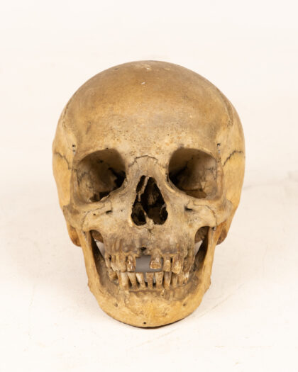 Vintage anatomical human skull. Detailed bone structure. A unique medical specimen perfect for collectors and scientific study. Displays natural aging.