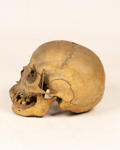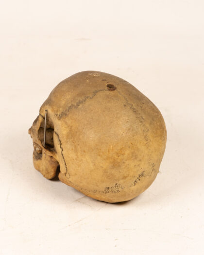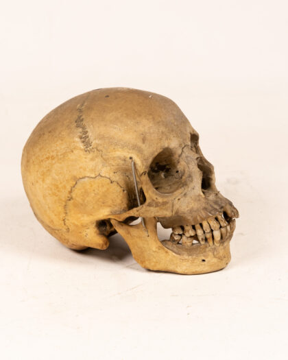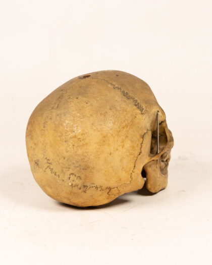 Anatomical human skull. This vintage anatomical specimen shows natural aging and bone structure detail. The skull exhibits a natural bone coloration with visible sutures and foramina. There's a small drilled hole at the top of the skull, and a thin metal wire is inserted through the cheekbone area. Signs of wear consistent with age. Perfect for collectors of medicalia, anatomical studies, or unique decorative display.