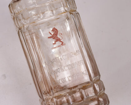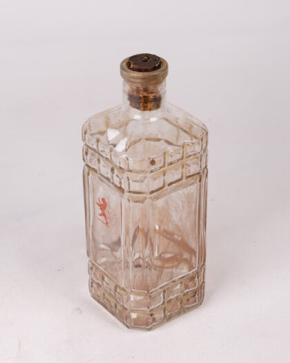Rare clear glass whisky bottle from Andrew A. Watt & Co. Londonderry. The square-shaped bottle features a grid design and a red lion logo with company text. Includes original cork. Some wear consistent with age. A unique piece of Irish distillery history.