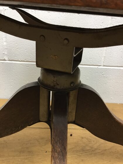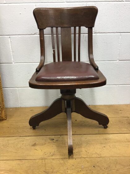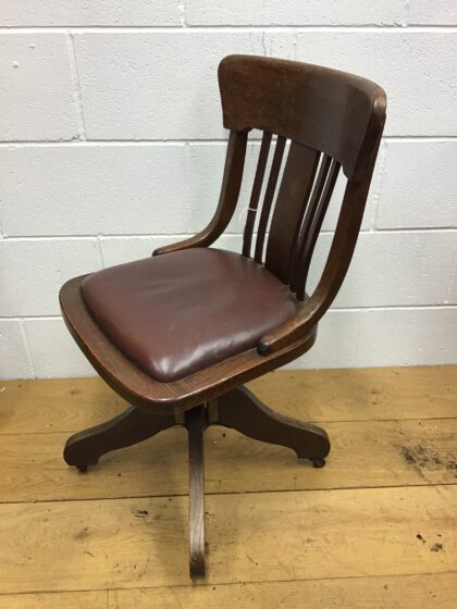 Sturdy office chair on castors and swivel base. This chair was built in the 1930s by Angus and was certainly built to last. 85cm height, 50cm deep, 45cm wide, approx 48cm seat height.