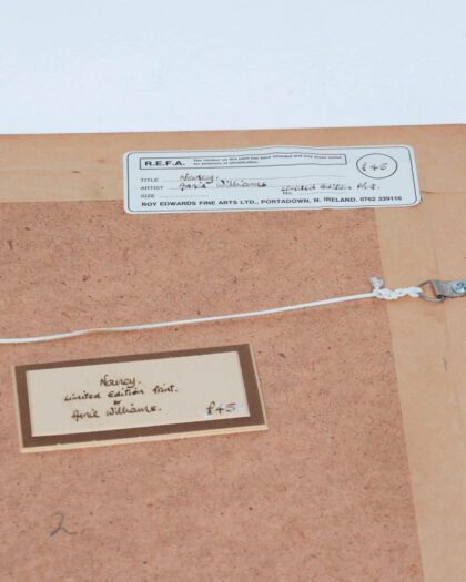 This is a limited edition print titled "Nancy" by the artist Anick Williams. The print is professionally framed and features a pastel colour palette with shades of blue and cream. The artwork is signed by the artist and numbered as a limited edition piece. The print is in excellent condition, with no visible damage or wear. The frame is made of wood and adds a touch of warmth to the piece. This print would look great displayed in a living room, bedroom, or home office.