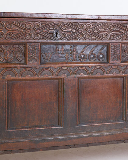This is an antique 17th Century carved oak coffer, dating back to the year 1666. The coffer features ornate floral carvings along the top panel and front, with a central panel inscribed with the initials 'HW' and the year '1666'. The construction is solid oak, displaying the natural grain and rich brown tones of the wood. The coffer shows signs of age, including some wear and tear, marks, and slight fading to the wood finish. This wear is commensurate with its age and history, adding to its antique charm. This coffer is a practical storage solution and a statement piece that could be displayed in a living room or bedroom.
