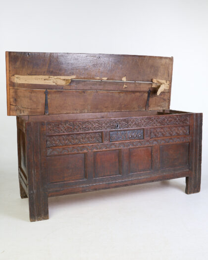 Antique 17th Century carved oak coffer with inscription HW 1666. Ornate floral carvings. Good condition, with some wear commensurate with age.