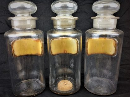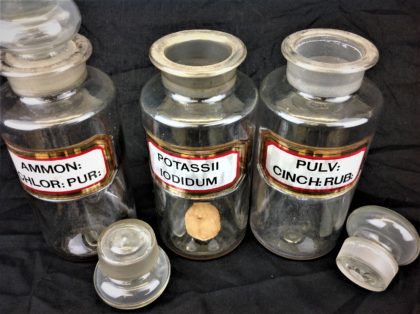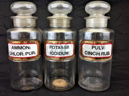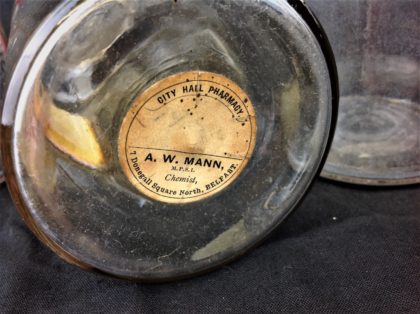 Good condition, no damage to bottle or glass toppers; labels are intact and remain colourful; chemist's shop label on the bottom of one bottle for CITY HALL PHARMACY BELFAST